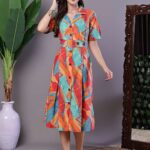 Effortlessly stylish dress with a vibrant abstract print, tie-up shoulder straps, and a chic high-low handkerchief hemline ? perfect for casual days or evening gatherings.
